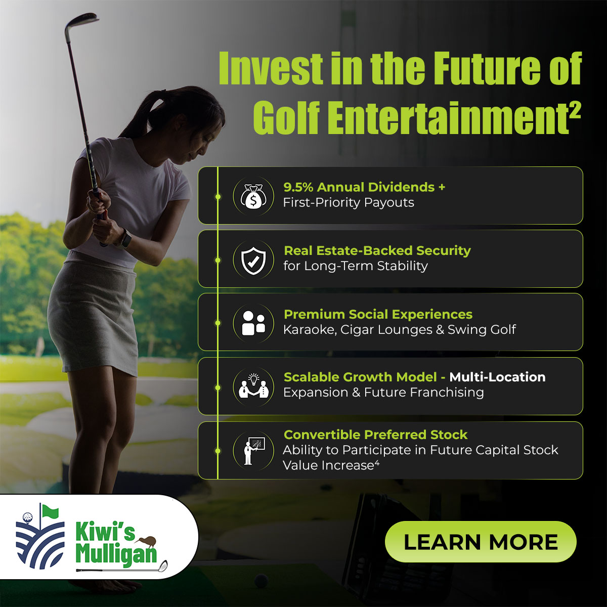 Kiwi’s Mulligan is where smart investing meets unforgettable experiences. With the Class A Preferred Stock possessing a 9.5% annual dividend and convertible into common stock, investors gain access to what we believe is a dynamic, revenue-rich concept that’s expected to transform how families, professionals, and communities come together to play, dine, and celebrate.